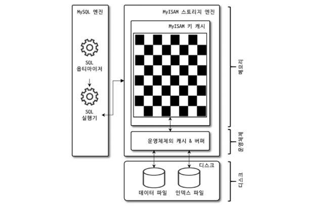 따라서 MyISAM 테이블의 데이터 읽기나 쓰기 작업은 항상 운영체제의 디스크 읽기 또는 쓰기 작업으로 요청될 수밖에 없다.