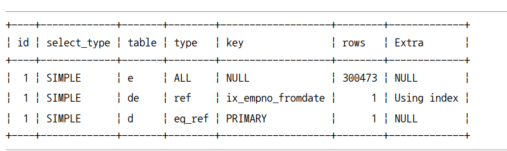 - 이 쿼리의 실행계호기을 확인해보면 departments 테이블을 드라이빙 테이블로 선택했고, 두번째로 dept_em 테이블을 읽은 뒤에 employees 테이블이 마지막으로 읽었음을 확인할 수 있다.