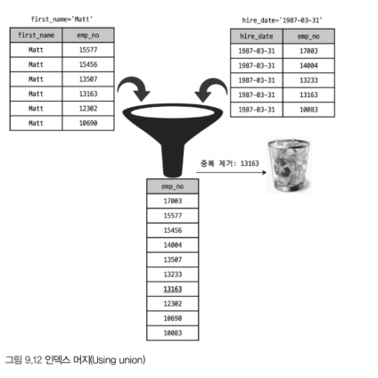- Union 알고리즘의 숨은 비밀은, first_name='Matt' 이면서 hire_date='1987-03-31'인 사원이 있었다면, 그 사원의 정보는 ix_firstname인덱스를 검색한 결과에도 포함 돼 있을 것이며, ix_hiredate 인덱스를 검색한 결과에도 포함되어 있을 것이다.