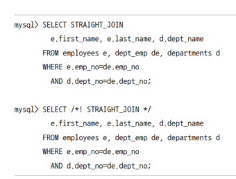 - 두 쿼리는 형태만 조금 다를 뿐 같은 쿼리다. (두 예제 모두 STRAIHT_JOIN 키워드가 SELECT 키워드 바로 뒤에 사용됐다는 것에 주의하자)