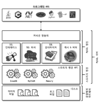 2) 스토리지 엔진 : mysql엔진은 dbms의 두뇌에 해당하는 처리를 수행, 실제 데이터를 디스크 스토리지에 저장하거나 디스크 스토리지로 부터 데이터를 읽어오는 부분은 스토리지 엔진이 전담함.